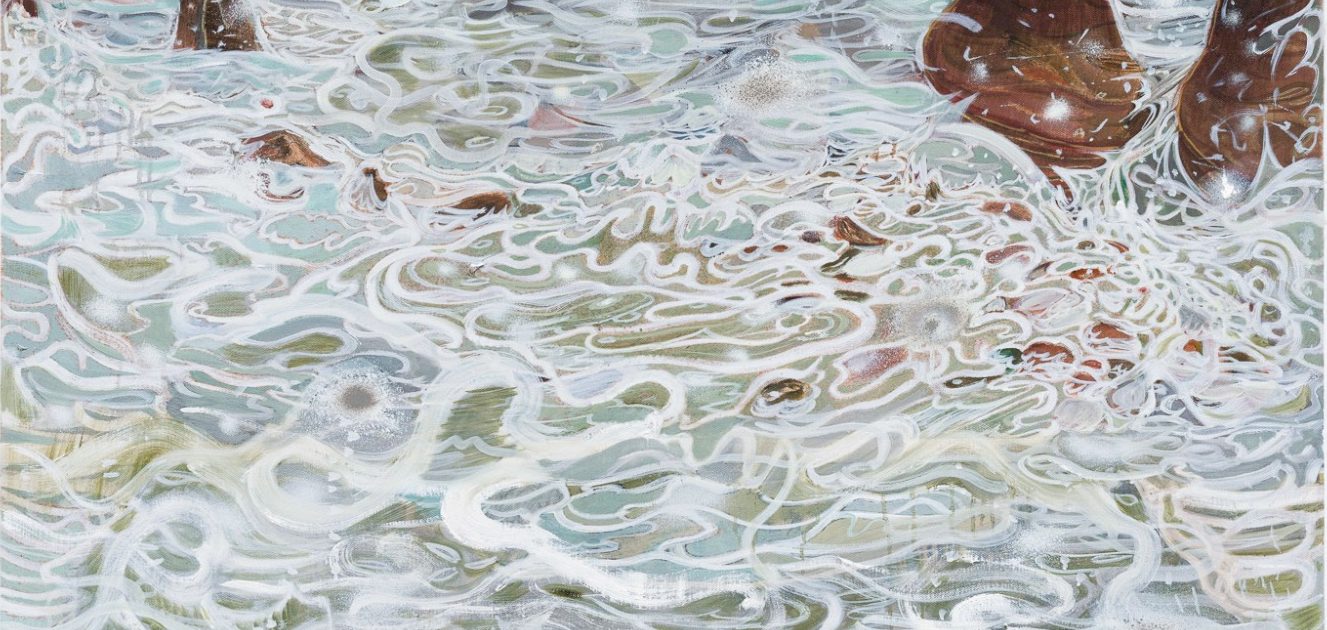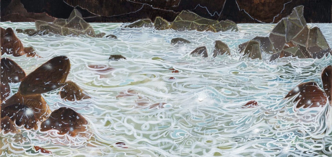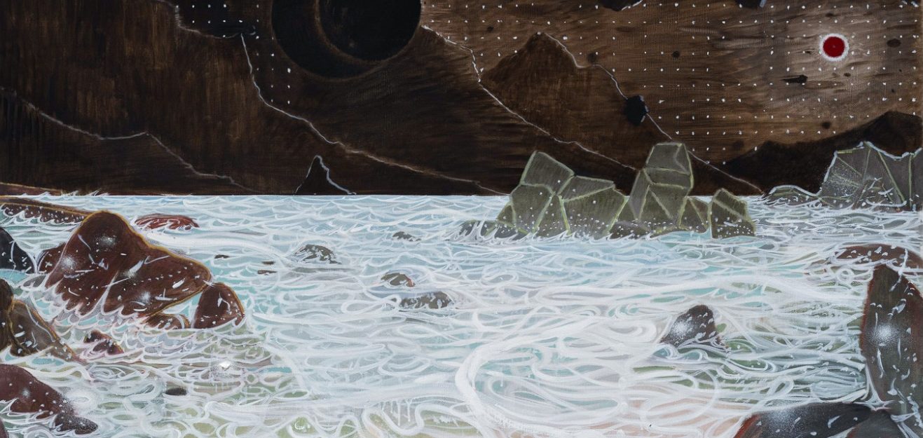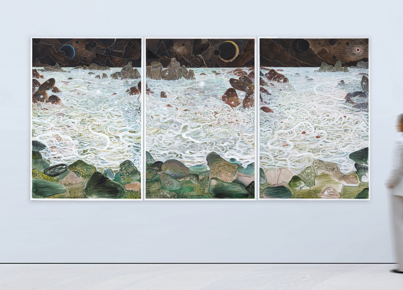 MOON SURGE, RIVER DRIFT, oil and acrylic on canvas, 2025, 175 × 360 cm (175 ×120 cm × 3)